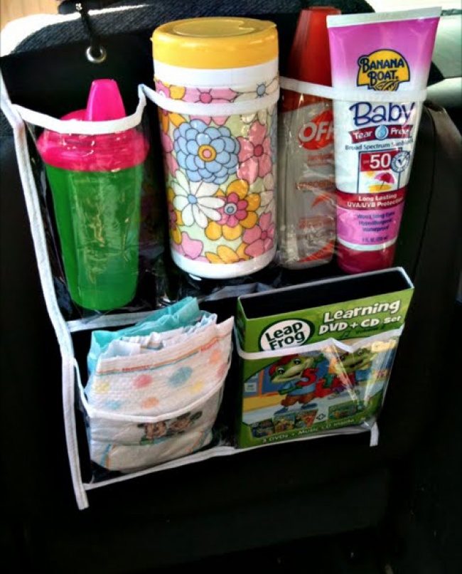 Чтобы помочь малышу в дороге, можно прикрепить к сидению органайзер для всякой мелочи