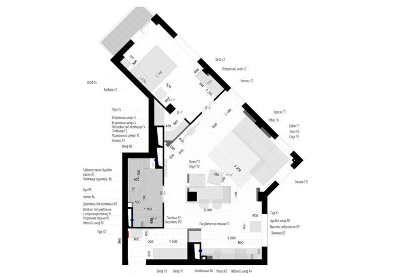 Для устройства комнат дизайнер предложила сделать диагональные стены, чтобы вместить все дверные проемы и не допустить пересечения мокрых зон, запланированных застройщиком и зафиксированных в плане БТИ. Эта геометрия оказала влияние на весь дизайн квартиры – во всех комнатах представлены графические решения, изменяющие облик пространства.