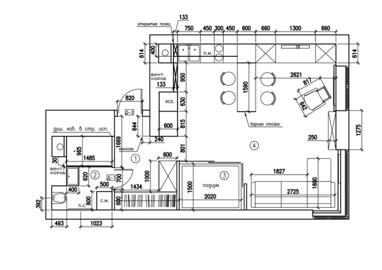 Исходя из пожеланий заказчицы – владелицы салона красоты, дизайнер создала современный интерьер в стиле лофт. Особенностью планировочного решения является то, что изолированные комнаты объединены, а спальня расположена в нише, на месте просторной прихожей.