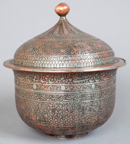 Разрешите пару поправок? 1. Ручки тай-казана выполнены в виде стилизованных коробочек хлопка, а не листьев лотоса. Тема лотоса в среднеазиатских орнаментах практически отсутствует, ибо лотос в немногочисленных водоемах Средней Азии не водится, а вот хлопковые коробочки можно встретить и на поле, и во всех орнаментах; 2. Верхний пояс — это арабская вязь, а не орнамент. И во 2-ом поясе (узком, разделенном на таблички) тоже надписи, и не только на арабском.