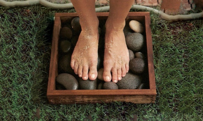 Водостойкая рама, наполненная гладкими камнями, — идеальная конструкция для ополаскивания ног.