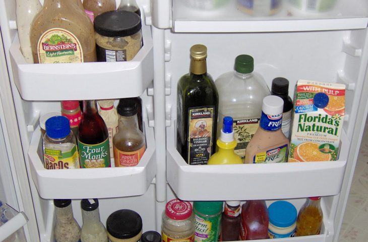 Поскольку дверь холодильника — это часть, смежная с внешней средой, где царит комнатная температура, хранить там скоропортящиеся продукты вроде яиц и молока мы вам категорически не советуем. Сок, приправы, майонез, газированная вода — этому самое подходящее место в дверных отделениях. Разве что лекарства уберите, новое тысячелетие на дворе.