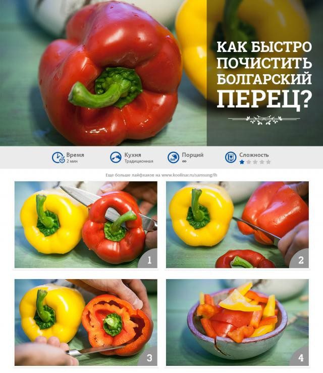Если чистить перец правильно, его подготовка к приготовлению не займет много времени! Вам потребуется: Отрежьте верхушку болгарского перца прямо под линией изгиба. Выдавите черенок из верхушки и выбросите его. Отрежьте другой конец перца. Снова положите перец на бок и проведите ножом по его внутренней части, удаляя семена и тонкие беловатые перегородки, которые также называются мембранами. Перец очищен!