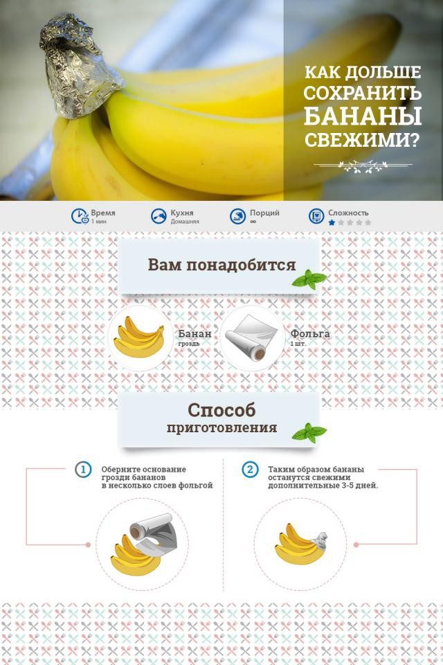 Обычно бананы быстро чернеют, но это можно предотвратить. Вам потребуется: Оберните основание грозди бананов фольгой в несколько слоев. Таким образом бананы останутся свежими дополнительные 3-5 дней.