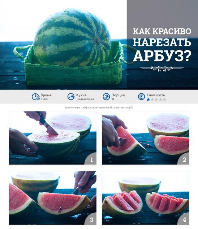 Нарезать арбуз красиво совсем просто! Вам потребуется: Разрежьте арбуз вдоль на две части. Полученные половинки разрежьте вдоль ещё раз. Ножом отделите мякоть и прямо в корке разрежьте её на дольки. Выложите четвертинку арбуза на блюдо и для красоты раздвиньте дольки попеременно в разные стороны. Таким образом арбуз станет настоящим украшением стола!