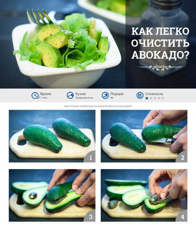 Очистить авокадо без труда можно всего в несколько движений. Вам потребуется: Сначала очистите авокадо от кожуры. Если плод свежий, просто срезайте кожуру также как при чистке картофеля. В ином случае сделайте 4 продольных надреза на кожуре по всей длине и, поддев каждую часть кожуры с одной стороны, аккуратно ее снимите. С более узкой стороны посередине разрежьте плод до косточки. Поворачивайте авокадо, не вынимая нож и упирая его в косточку. Разрез должен получиться так, чтобы половинки были максимально одинаковыми. Отделите одну половинку авокадо от другой, придерживая нижнюю и как бы снимая с нее верхнюю. Чайной ложкой подцепите косточку и выньте ее. Если косточка плохо отходит, сделайте поворот чайной ложкой и выньте ее. Не забудьте полить авокадо лимонным соком — это поможет сохранить естественным цвет фрукта и не даст ему потемнеть!