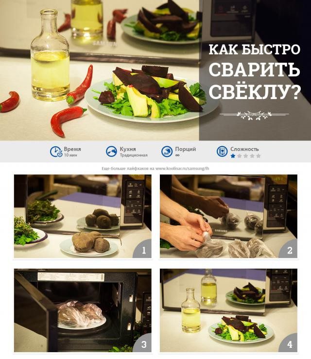 Для варки свёклы уйдет совсем немного времени! Вам потребуется: Помойте свёклу. Не очищая, положите ее вместе с хвостиком в простой полиэтиленовый пакет и плотно завяжите пакет на узел. Положите корнеплод в микроволновку на 15 минут. После завершения процесса приготовления оставьте свёклу еще на 5 минут. Готово!
