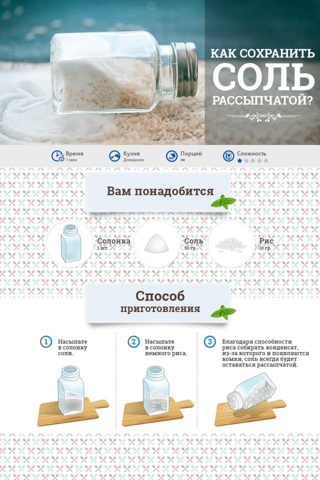 Соль больше не будет склеиваться в комки! Вам потребуется: Насыпьте в солонку немного риса. Благодаря способности риса собирать конденсат, из-за которого и появляются комки, соль всегда будет оставаться рассыпчатой.