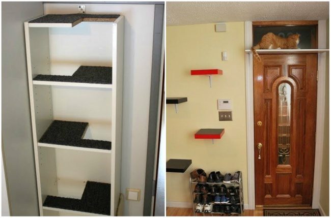Вырежьте квадратные отверстия в книжной полке — устройте для этого лентяя тренировочную башенку. Еще один вариант — сделать лесенку из полочек IKEA (или любых других), чтобы ваш исследователь мог покорять новые высоты.