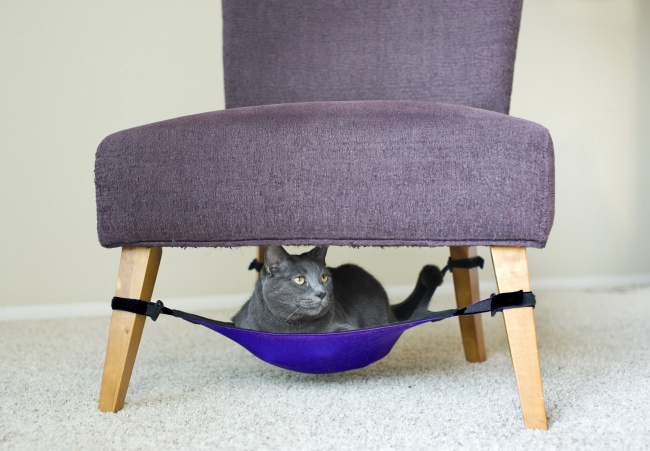 Кусок ткани и застежки на липучке могут стать отличным гамаком, который можно закрепить под стулом. Ваш кот всегда будет рядом.