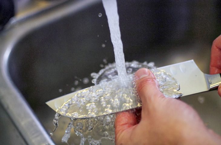 Гора посуды, замоченная в воде с моющим средством — картина вполне знакомая. Однако ножам там делать нечего: скользкий острый нож потенциально опасен. Дабы не искушать судьбу, помойте нож сразу после работы и уберите туда, где ему место.