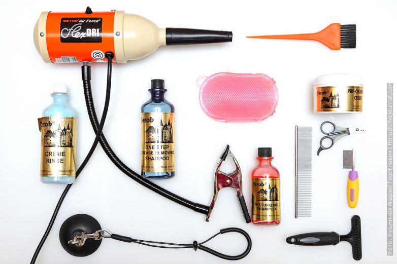 21. Шаг 15. Фиксируем животное в том месте, где будем его расчесывать и сушить. Расчесываем шерсть. Расческу и фен ведем одновременно в одном направлении.
