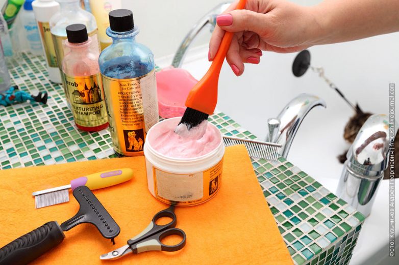 16. Шаг 10. Наносим на шерсть животного крем (бальзам). Во время мытья мы смыли весь жир с шерсти. Чтобы не пересушивать кожу и шерсть животного теперь необходимо нанести на шерсть крем (бальзам после мытья).