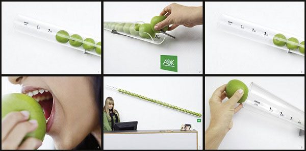 Пластиковая труба заполнена настоящими яблоками по количеству дней в месяце. Съедая по яблоку в день, вы поддерживаете свое здоровье, утверждает медицинская страховая компания AOK.