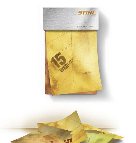 Агентство Euro RSCG Duesseldorf придумало для выдувателей листьев осенний календарь со специальным механизмом, который ежедневно отрезал по листу и сбрасывал его на пол, напоминая тем самым о проблеме уборки в частности и олицетворяя собой осенний листопад в целом.
