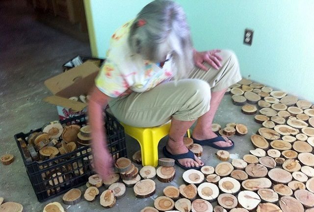Нанеси на деревянные кружочки слой полиуретана. После его высыхания заполни поверхность пола между кружочками смесью: 80 % строительного раствора с песком, 20 % опилок. В конце нанеси 2-3 слоя полиуретана, пол будет восхитительно блестеть!