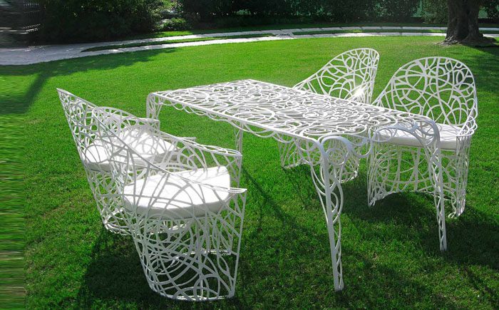 Пластик с этим вряд ли справится. Дерево выглядит красиво, но требует постоянного специального ухода. А вот кованая мебель при всей её дороговизне полностью оправдает затраты.