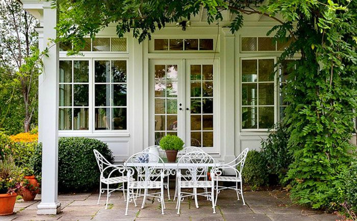 Белый комплект мебели смотрится потрясающе, особенно в соответствующей обстановке. Нужно только не забывать элементы, например, цветочный вазон, которые помогут объединить мебель с домом и окружающим ландшафтом в единое целое.
