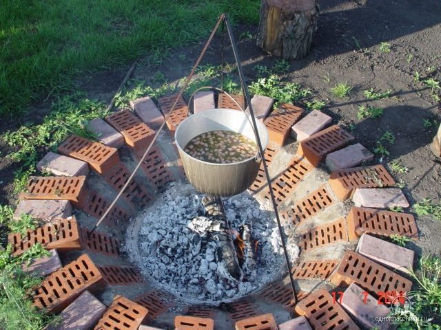 Открытый очаг из кирпичей и треножник — и можно уже вскипятить чай или приготовить еду.