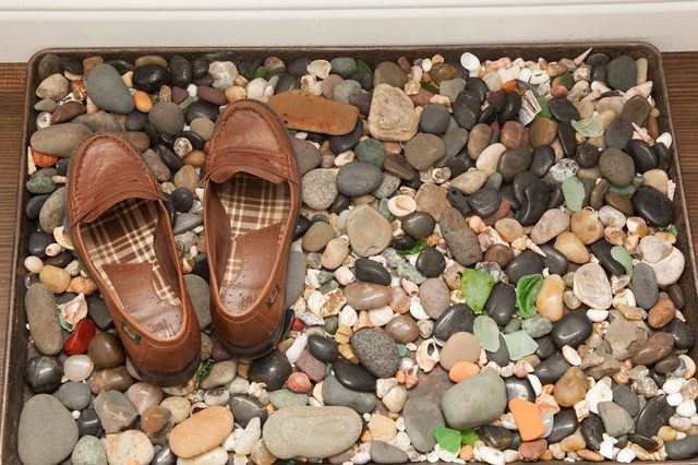 Старый поднос или большая форма для выпечки, заполненная галькой или простыми камешками, станет прекрасной подставкой для обуви, особенно, когда на улице мокро и грязно.