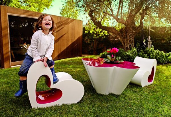 Взрослым после тяжёлых трудовых будней, безусловно, нужно отдыхать, но и о детях забывать нельзя. Для них Agatha Ruiz de la Prada предлагает невероятно красивый и стильный комплект для отдыха на свежем воздухе, состоящий из стола в форме цветка и стульев в форме сердечек.