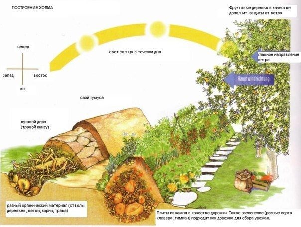 Одной из разновидностей приподнятой теплой грядки служит сооружение в виде удлиненного холма. В этом случае бортики не делают, а края грядки скругляют. Как это выглядит, отлично видно на рисунке, который я нашла в интернете: