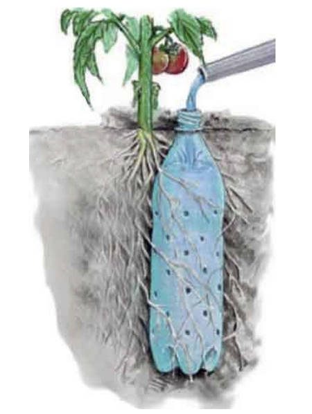 Сделайте несколько отверстий в пластиковой бутылке, закопайте ее рядом с корневой системой растений, оставив горлышко на поверхности, и поливайте свои растения через это горлышко. Орошение и качественный полив всем растениям вашего огорода обеспечены!