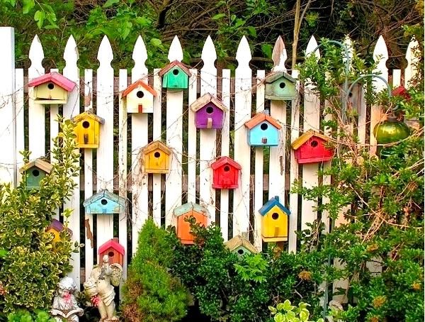 Даже если у вас уже несколько лет стоит простой деревянный забор, его легко можно обновить с помощью декора. Например украсить маленькими разноцветными домиками.
