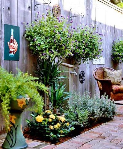 Просто представьте, что забор — это стена комнаты в вашей квартире. Повесьте комнатные растения, картины и прочие арт-объекты.