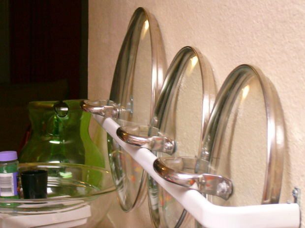 17. Установите пластиковые поручни: не для того, чтобы держаться за них, а для удобного хранения крышек от кастрюль.