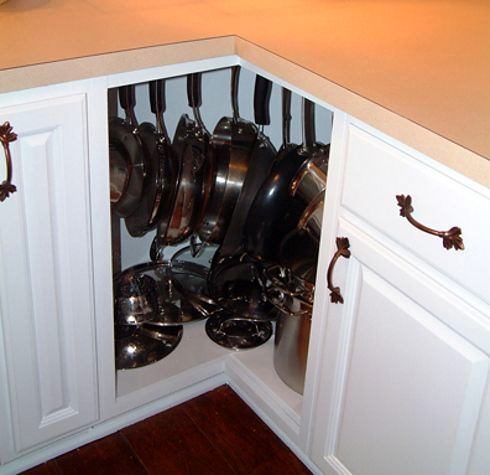 13. Неудобные угловые шкафы тоже можно приспособить для хранения сковородок, используя подвесные крючки.