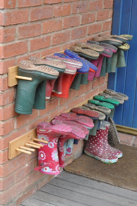 Если обувь будет храниться на улице, для неё можно соорудить небольшой домик, спасающий от дождя либо сделать небольшие вешалки для резиновых сапог на свежем воздухе. Желательно, делать такой держатель под навесом, чтобы обувь не выцветала и не портилась на солнце.