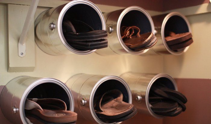 Хранить обувь можно даже в высоких жестяных банках. Их них можно сделать интересный органайзер, в который удобно складывать летние шлёпки или домашнюю обувь. Из подручных материалов также могут пригодиться старые доски и паллеты. Они отлично впишутся в экостиль и кантри. А детские сапожки и ботинки удобно хранить в металлических или плетёных корзинах, которые для удобства можно повестить на стену.