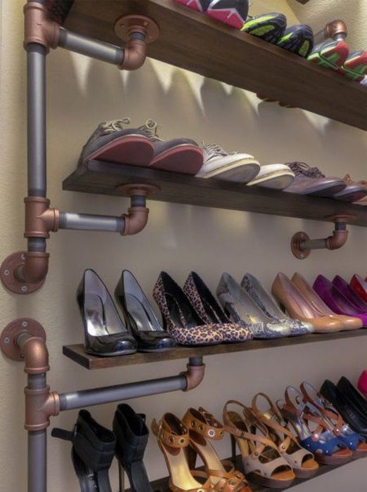 Ещё один достаточно необычный вариант показать обувь во всей красе – соорудить оригинальный стеллаж для неё. Для создания эксклюзивного предмета мебели пригодятся старые доски и даже сантехнические трубы. Конечно, такая система хранения подойдёт далеко не под каждый интерьер, но любителям индустриального стиля придётся по вкусу.