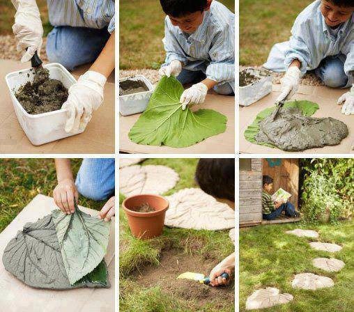 Выложите на лопух густой раствор цемента, тщательно прижмите форму, даем раствору застыть, и получаем интересный декоративный элемент в форме и с рисунком листа.