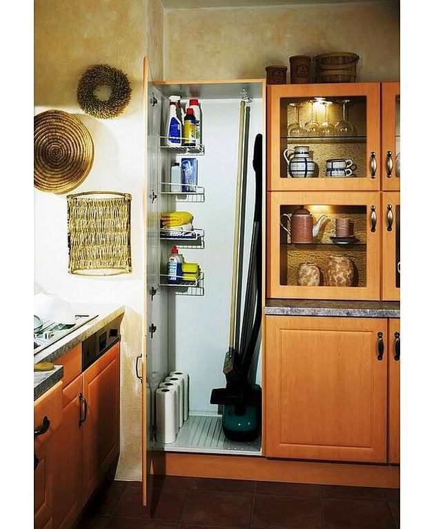 4. Храните средства для уборки в кухонном гарнитуре. Высоту полочек отрегулируйте под высоту ручек швабры.