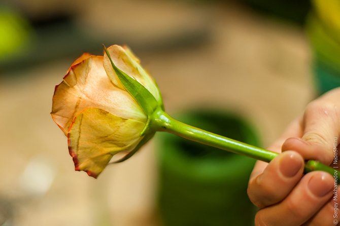 4. У розы срез должен идти наискосок. Так к цветку поступает больше воды и доступ к ней не перекрывается донышком вазы. Купив цветы там, где их правильно хранили, вы сильно повысите шансы на то, что они будут долго радовать девушку.