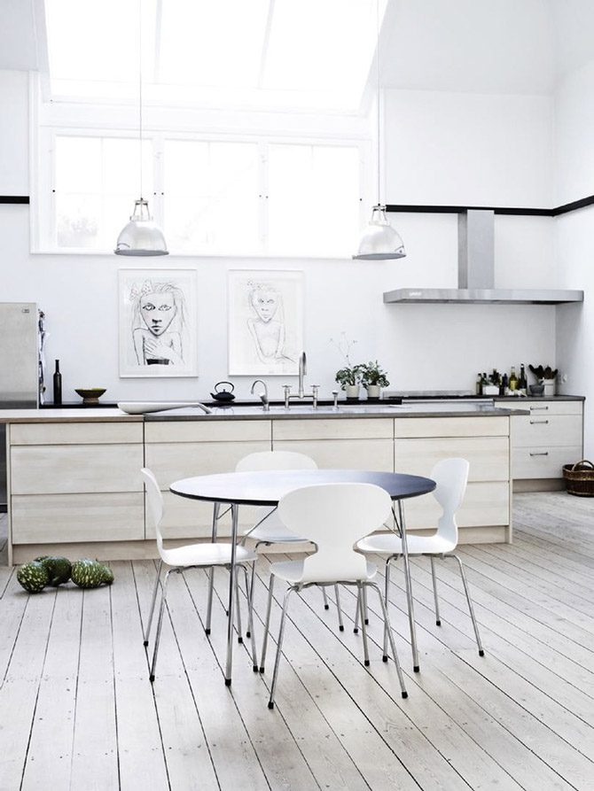 Скандинавская кухня в светлых тонах выглядит настолько чудесно и просторно, что даже картины, на которых изображена девочка с лицом лепрекона, здесь смотрятся довольно гармонично.