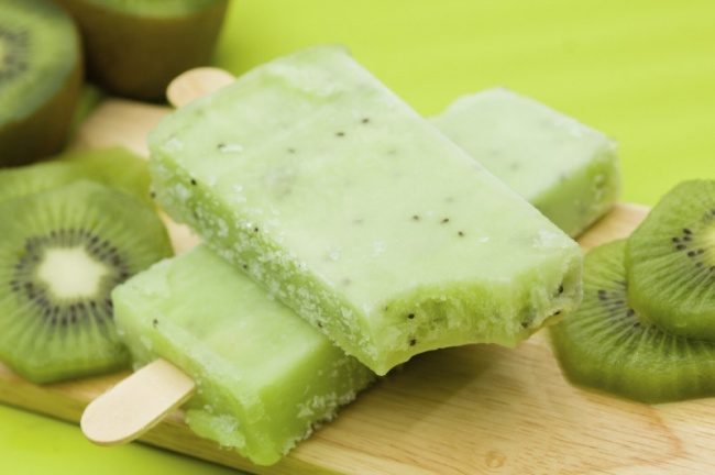 Измельчить в блендере киви, смешать его с любым из ваших любимых соков. Подсластить медом и залить в формочки.
