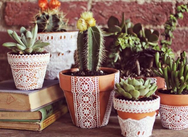 Для интерьеров в стиле «прованс» или любом другом нежном и романтическом стиле подойдут комнатные растения в горшках ручной работы, украшенных изящным летящим кружевом. Легкая кружевная ткань станет акцентным пятном в интерьере, символизируя свободу и чувственность романтического стиля. Для того, чтобы сделать такой цветочный горшок своими руками, понадобится кружево, клей и сам горшок, который будет использоваться в качестве основы для будущего шедевра.