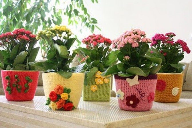 Если вы любите и умеете вязать, украсьте цветочные горшки вязаной тканью. Для этого необходимо связать небольшой чехол по размеру горшка. Используйте однотонную пряжу или сочетания нескольких цветов, которые пришлись вам по душе. Благодаря цветочным горшкам, украшенным вязанием, в доме появится ощущение тепла и уюта.