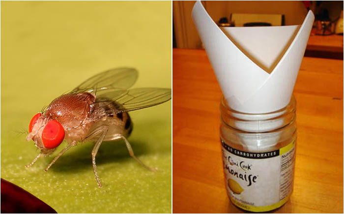 Можно взять обычную стеклянную банку и налить в неё немного сахарного сиропа, чтобы только покрыл донышко. Из бумаги сделать конус по размеру горлышка банки, кончик чуть обрезать, чтобы мушки могли пролететь в отверстие, и поставить в банку. При помощи скотча закрепить конус так, чтобы насекомые не могли пробраться между краями банки и конусом. Плодовые мушки не смогут выбраться наружу из такой ловушки. Нужно лишь не забывать регулярно её менять.