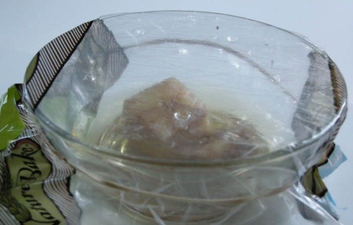 Хорошей ловушкой будет банка, в которую нужно налить немного вина или уксуса и капнуть жидкого мыла. Горлышко закрывается фольгой или плёнкой, которая в нескольких местах протыкается зубочисткой.