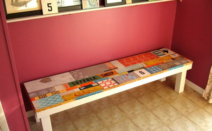 Коллажи снова в моде, это настоящая радость для творческих людей. Обыкновенная скамья в прихожей может теперь совершенно преобразиться.