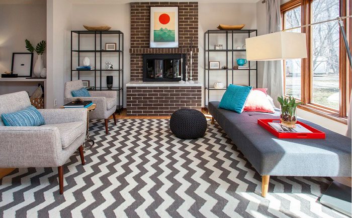 Для комнат с необычной планировкой лучше всего использовать ассиметричные ковры. Можно даже положить их сверху на большой традиционный ковёр. Кроме того, что ковёр может ограничить зону, он ещё может стать ярким цветовым акцентом. В целом стоит признать, что современные ковры в традиционных интерьерах смотрятся великолепно, нужно лишь применить несколько простых правил оформления.
