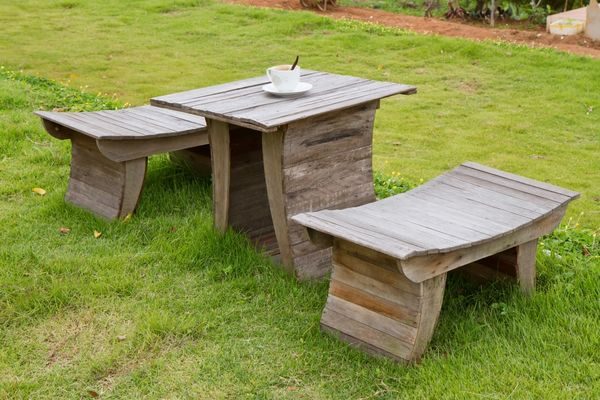 Те, кто с молотком дружит, могут из старых дощечек соорудить вот такой, к примеру, комплект садовой мебели: