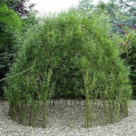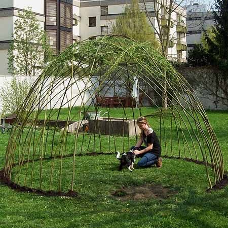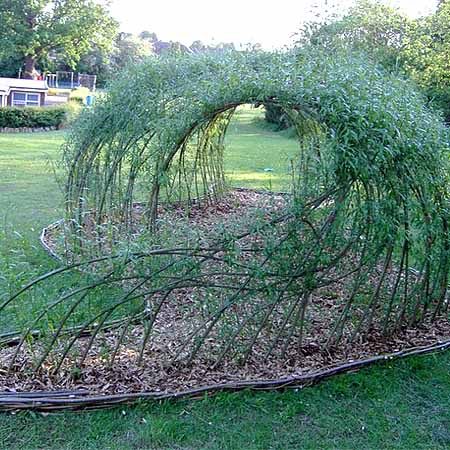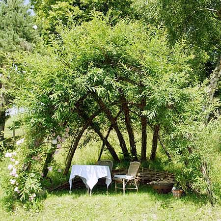 Идея сделать красивую беседку из ивы кажется оригинальной, но не очень простой. Если честно, то достаточно знать основы создания такой беседки и просто начинать втыкать в землю лозу. Когда ивняк поднимется сообразить, как его организовать в шатер, будет легко.