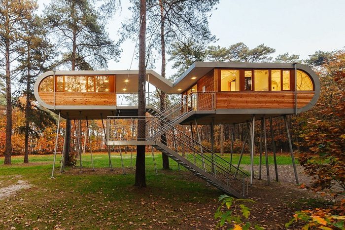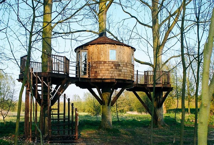 Архитектурной фирмой Blue Forest был спроектирован домик на дереве Woodland Den Tree House. Вся конструкция расположена на трех деревьях. Из окон круглого домика открывается обзор на 360 градусов. Кроме того, хозяева могут выйти на площадки и полюбоваться природой. Домик удерживается на деревьях при помощи балок и резинки, охватывающей стволы в области крыши и пола. Таким образом, ничего не мешает деревьям продолжать расти.
