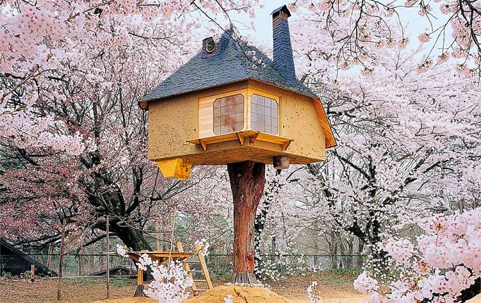 Этот чайный домик на дереве (Treehouse Tetsu) расположен почти что в идеальном месте: среди цветущих сакур. Он является частью Музея искусств Kiyoharu Shirakaba. Конструкция выполнена таким образом, что во время сильных порывов ветра, она может раскачиваться в разные стороны без риска быть разрушенной.