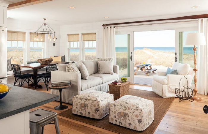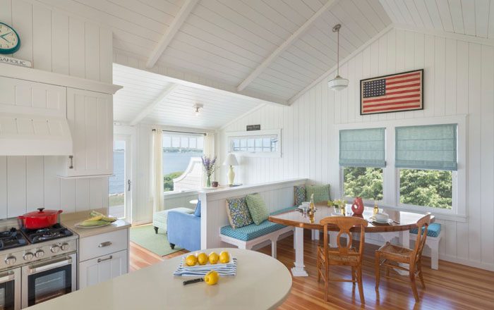 Стены и потолки можно отделать деревянными панелями, покрашенными в белый цвет. Это поможет создать атмосферу беззаботного пляжного домика. К тому же светлая цветовая гамма визуально увеличит пространство.